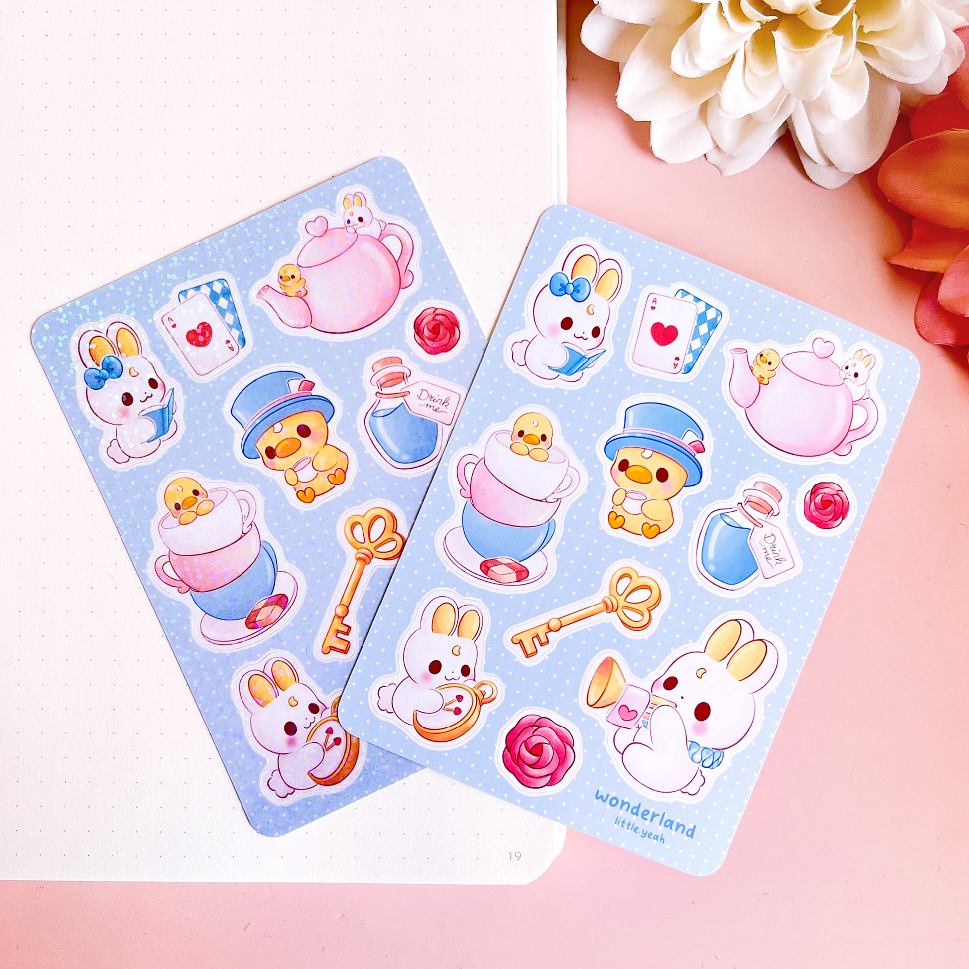 Dive into a magical world with Yuna the Bunny and Piyo the Duck! This cute sticker sheet captures their fun adventures in wonderland. You’ll find 11 adorable stickers, featuring Yuna with a clock and Piyo relaxing in a tower made of cups, plus more delightful designs. Perfect for journaling, writing letters, or decorating gifts, these stickers are made with love on matte sticker paper, with an option for a dreamy holographic finish. Bring a sprinkle of joy to your projects with this lovely sticker sheet! Size of the Sticker Sheet is 8.5 x 11.7 cm.